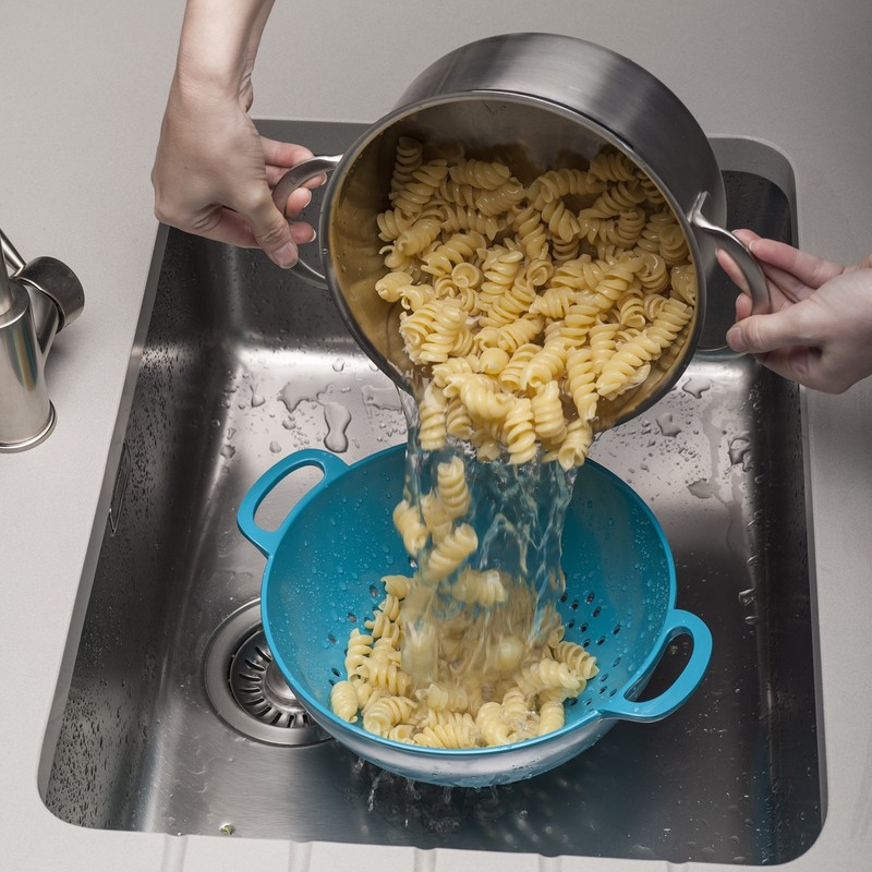 - Stands without support due to the circular foot on the base and there are holes in the base of the colander ensuring no liquid remains