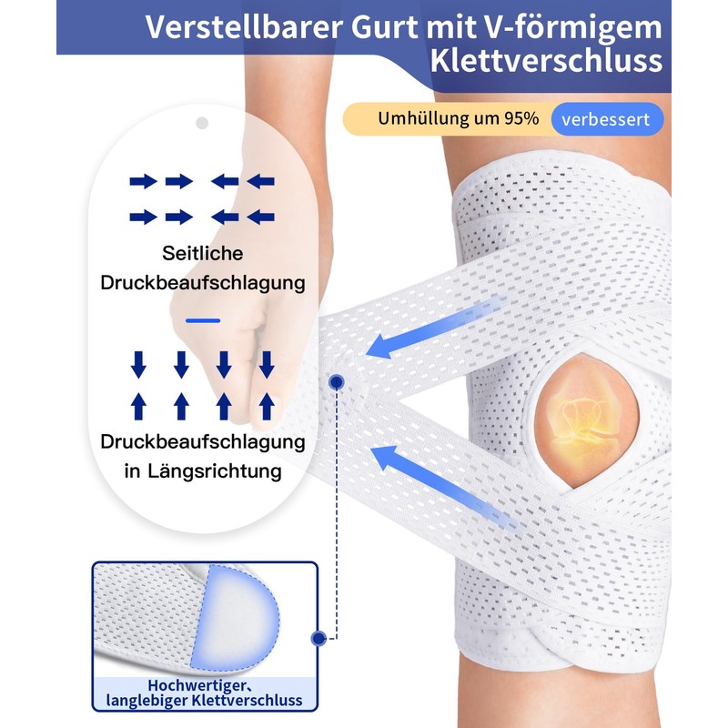 - 2 adjustable V-shaped Velcro design: improve the defects of similar products, carefully designed two V-shaped adjustable pressure straps, not easy to slide. The curves on both sides of the knee brace are ergonomically designed. The middle of the patella has an open design, which makes the knee brace better attached to the knee, making it more stable than other same products on the market, so that the knee pads fit perfectly with the knee joint.