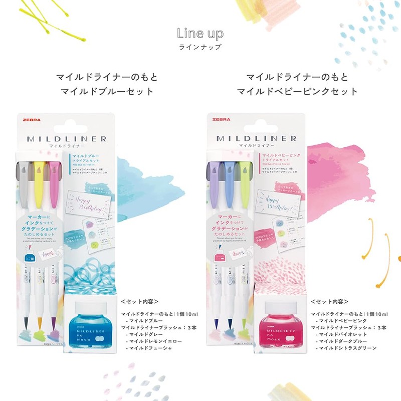 - Set Contents: Mildliner (mild baby pink ink), mildliner brush (mild violet, mild dark blue, mild citrus green)