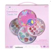 A travel friendly three tier cosmetic set comes in a variety shades of lip glosses, and eyeshadows.