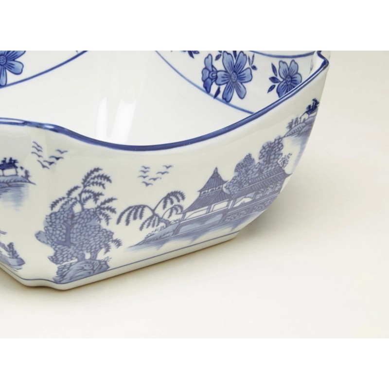 The Square Blue And White Bowl is a captivating piece of dinnerware that seamlessly blends timeless elegance with a classic Blue Willow design. Crafted from blue and white transferware porcelain, this square bowl offers a stunning visual appeal. Measuring 4.5 inches in height and 8.75 inches in width and depth, this bowl provides ample space for serving a variety of dishes. Its square shape adds a modern twist to the traditional Blue Willow pattern, making it a versatile addition to your tableware collection. The exterior of the bowl showcases the iconic Blue Willow design with its intricate scenes of bridges, pagodas, and willow trees in rich blue hues. On the inside, a delicate floral border adds an extra layer of charm and sophistication. Whether you're using it for everyday meals or special occasions, this bowl is sure to impress your guests. Its durable porcelain construction ensures it can withstand the rigors of daily use while maintaining its exquisite appearance. As a gift, the Square Blue And White Bowl is a thoughtful choice for anyone who appreciates classic design and quality craftsmanship. Whether for housewarming, weddings, or other celebrations, this bowl's timeless beauty and versatility make it a delightful present that will be cherished for years to come.
