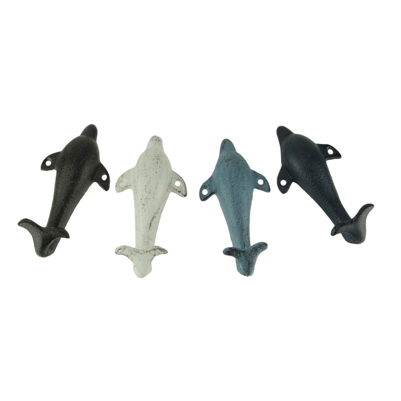 Zeckos Set of 4 Colorful Coastal Cast Iron Dolphin Decorative Wall Hooks 6 inch