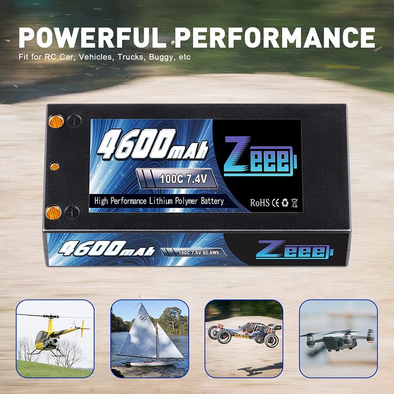 Zeee 2S Shorty Lipo 7.4V 100C 4600mAh Hardcase Lipo Battery with 4mm Bullet Deans Connector for RC 1/10 Scale Vehicles Car, Trucks, Boats