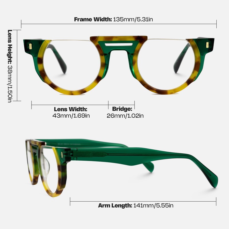 - Dimension-Lens Width:43mm(1.69'') | Lens Height:38mm(1.50'') | Bridge Width:26mm(1.02'') | Frame Width: 135mm (5.31'') | Arm Length: 141mm (5.55'').