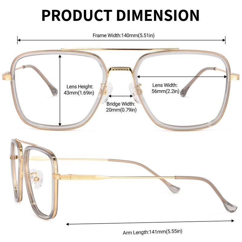 - DIMENSION - Lens Width: 56mm (2.2") | Lens Height: 43mm (1.69") | Bridge Width: 23mm (0.79") | Frame Width: 140mm (5.51") | Arm Length: 141mm (5.55")