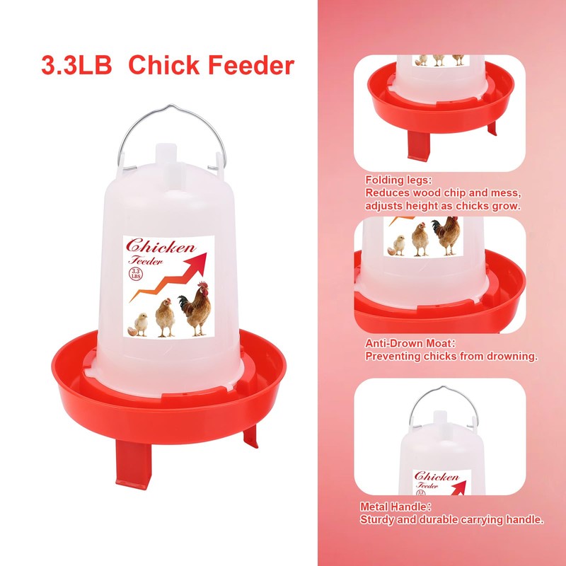 - Chick Feeder and Waterer Kit :This convenient set includes a 3.3LB (1.5KG) chick feeder and a 0.4-gallon (1.5L) waterer, designed to meet the essential needs of baby chicks, ducks, and other small poultry. Perfect for brooders, coops, or backyard farming!