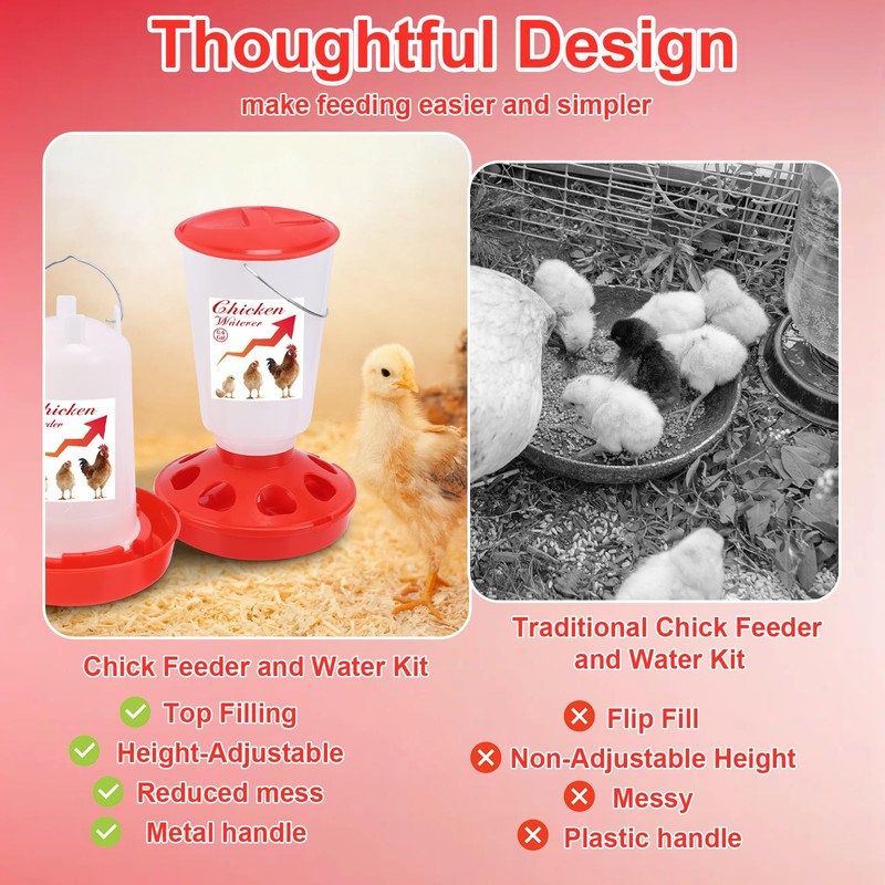 - Easy Use : The chick feeder and chick waterer both feature top-fill openings, making refills quick and mess-free.Our chick feeder and waterer set with anti-tip design,which means your chicks will stay warm and dry that will be most important for their survival.