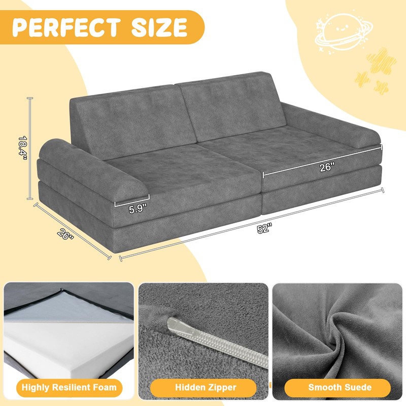 - 【Perfectly Sized】Measuring 52 x 26 x 18.4 inches, this versatile kid modular couch seamlessly fits in bedrooms,playrooms,or family rooms,complementing any home décor.Built for extended use,kids room furniture evolves alongside your child: in toddler years, it serves as a safe climbing mat, and as they grow,it transforms into a modular building set,sofa,bed,or whatever their imagination inspires..