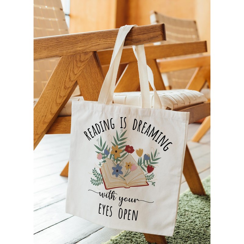 Zeghk Canvas Book Tote Bagfor Women, Book Lovers Gifts, Book Accessories, Reading is Dreaming with Eyes Open Book, Reusable Grocery Bags, Librarian Gifts, Bookish Gifts, Gifts for Readers
