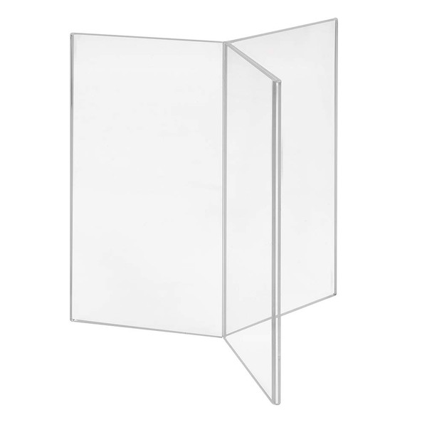 Table stand made of crystal clear acrylic glass. Star shaped with 3 viewing pages and 6 insertion pages in DIN long format. Portrait orientation Insert format 6 x 105 mm x 210 mm or 3 x 210 mm x 210 mm. Made from crystal clear UV resistant acrylic glass. Glossy edges. The acrylic glass of this advertising stand is protected by a one-sided protective film for manufacturing, warehousing and transport. The protective film can be easily removed. A Zeigis branded product.