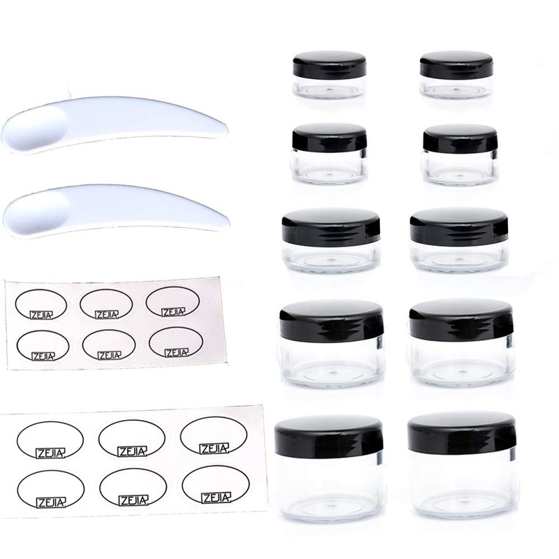 ZEJIA 10pcs Sample Containers with Screw Lids,5 Size 3/5/10/15/20 Gram Empty Cosmetic Jars with 12pcs Lables and 2pcs Mini Disposable Spatula,Makeup Sample Containers BPA Free