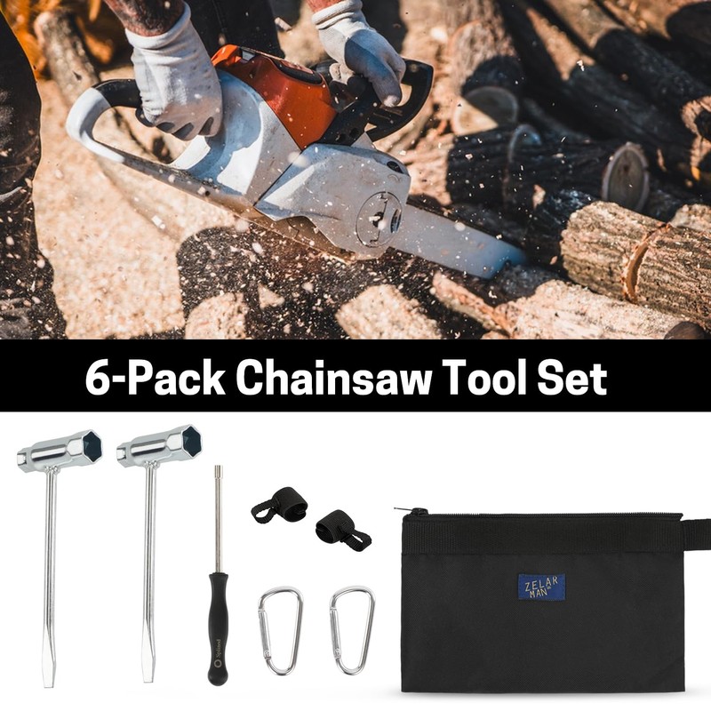- Complete 6-Piece Chainsaw Tool Set: This all-in-one chainsaw tool kit includes 2 chainsaw wrenches (13mm by 19mm), 2 carabiners, 2 hook-and-loop elastic straps, 1 carburetor screwdriver, and 1 storage pouch. Everything you need for chainsaw maintenance and on-the-go repair.