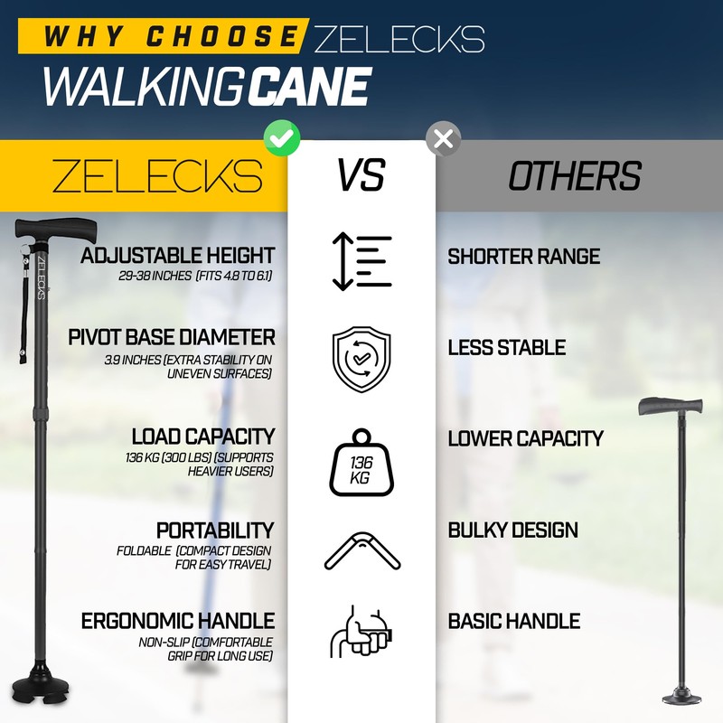 • Stable Stride: Experience freedom with ZELECKS womens canes for walking—a stability marvel. Its wide aluminum pivot base guarantees durability that can withstand any terrain. With a 360-degree rotating base, enjoy reliability with every step you take
