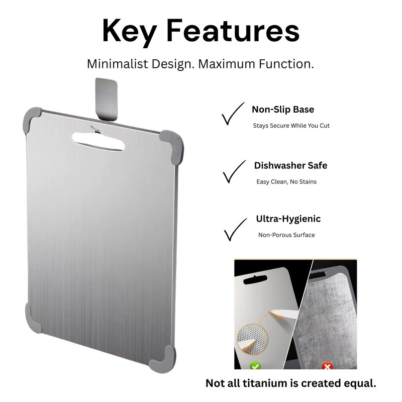 - Modern, Minimalist, and Easy to Clean Double-sided, easy to wash, and designed to last. Elevate your kitchen with one of the top-rated titanium cutting boards on the market.