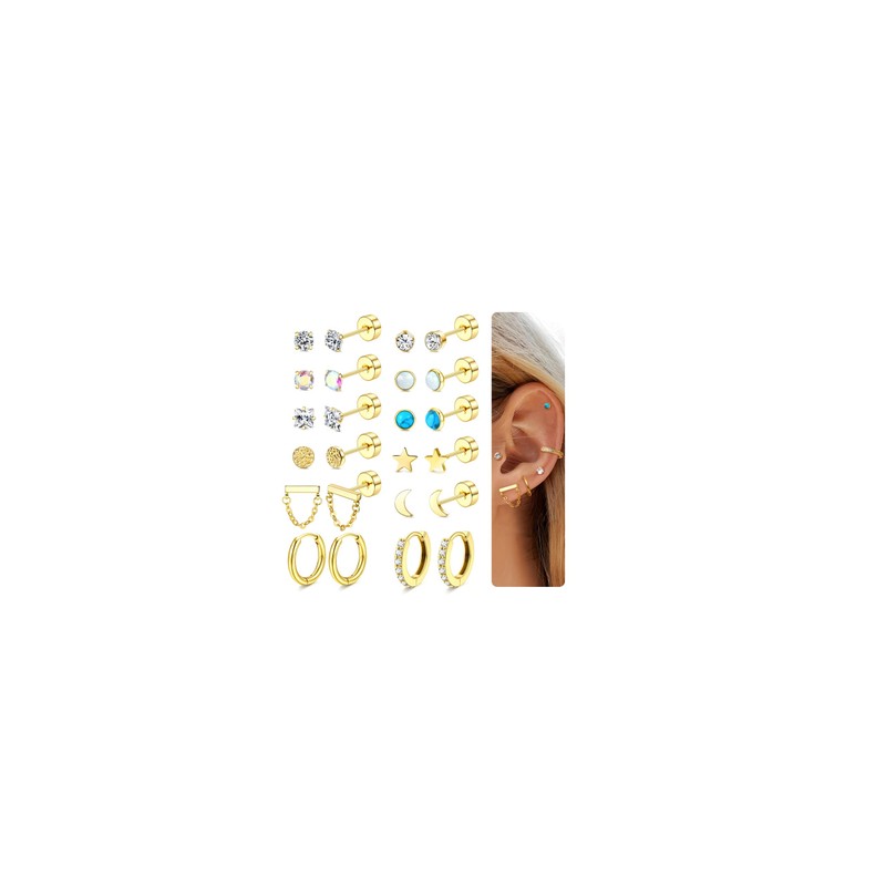 - [Earrings Set for Multiple Piercing] 10 Pairs Flat Back Studs Earrings and 2 Pairs Huggie Hoop Earrings in One Order. Including Multi Color CZ Flatback Earrings, Opal, Turquoise and Pearl Flat Back Studs, Stylish Butterfly Stud Earrings and Chain Dangle Earrings. Hypoallergenic Earrings Set for Multiple Piercing, More Choice for Daily Wearing or Dress Up.