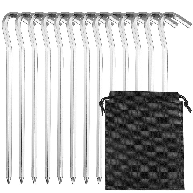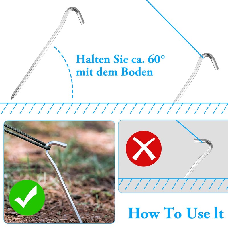 • Hakendesign: Die Oberseite der Zeltheringe ist mit rutschfesten Haken ausgestattet, die einen besseren Halt haben als runde und ideal zum Befestigen von Seilen oder zum Verankern von Vordächern sind.
