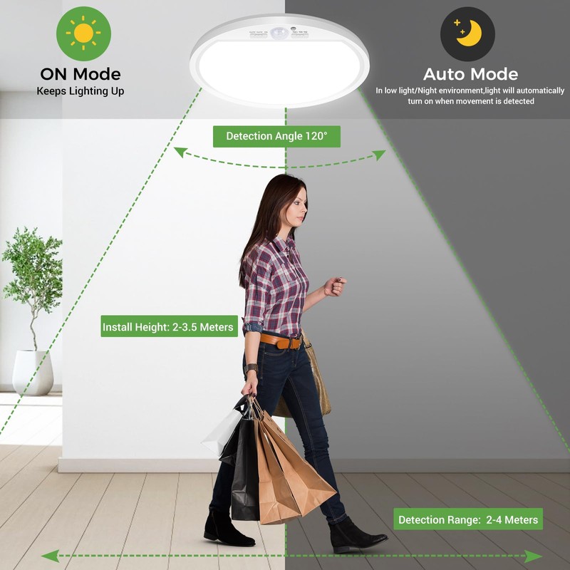 - ??Multifunktionale 3-Modus-Option??Benutzen Sie den Schiebeschalter, um zwischen den Modi Ein, Auto und Aus zu w?hlen. Der Auto-Modus aktiviert intelligent das Batterielicht im Dunkeln, wenn eine Bewegung erkannt wird. Diese LED-Deckenleuchte hat einen leistungsstarken PIR-Infrarot-Bewegungsmelder mit einem Erfassungswinkel von 120??und einer Reichweite von 22 Fu? (Durchmesser)