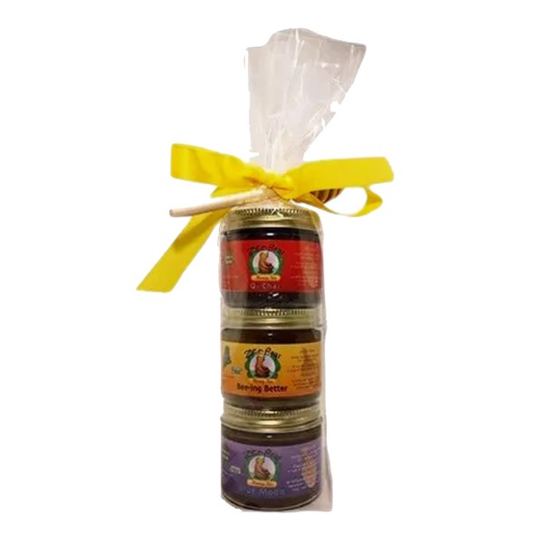 - Our three best-selling honey tea flavors; Bee-ing Better, Qi Chai, and Blue Moon, packaged in a biodegradable cellophane bag with bow and honey dipper.