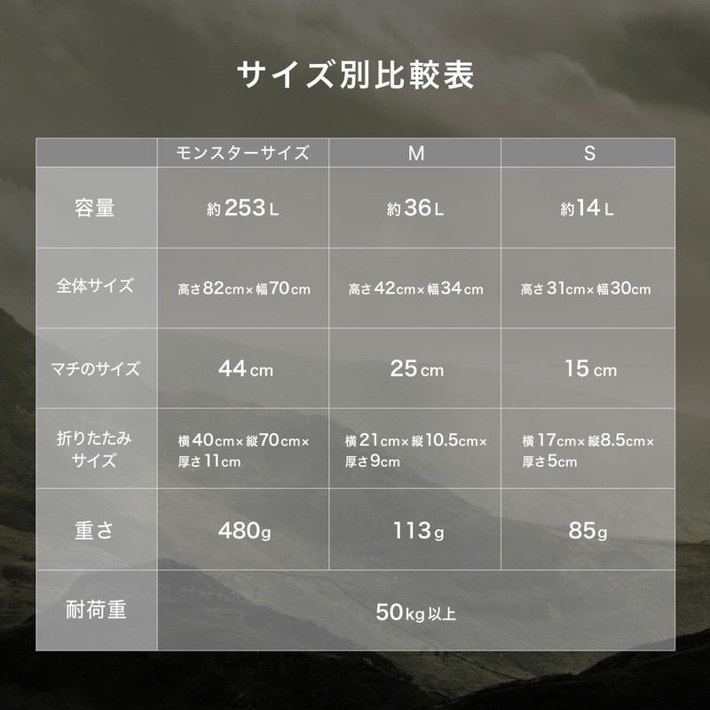 - [Capacity] (S) about 14L (M) about 36L [Size Used] (S) height 31cm x width 30cm (M) height 42cm x width 34cm [Folding size] (S) width 17cm x height 8.5cm x thickness 5cm (M) 21cm x height 10.5cm x thickness 9cm [Weight] (S) 85g (M) 113g