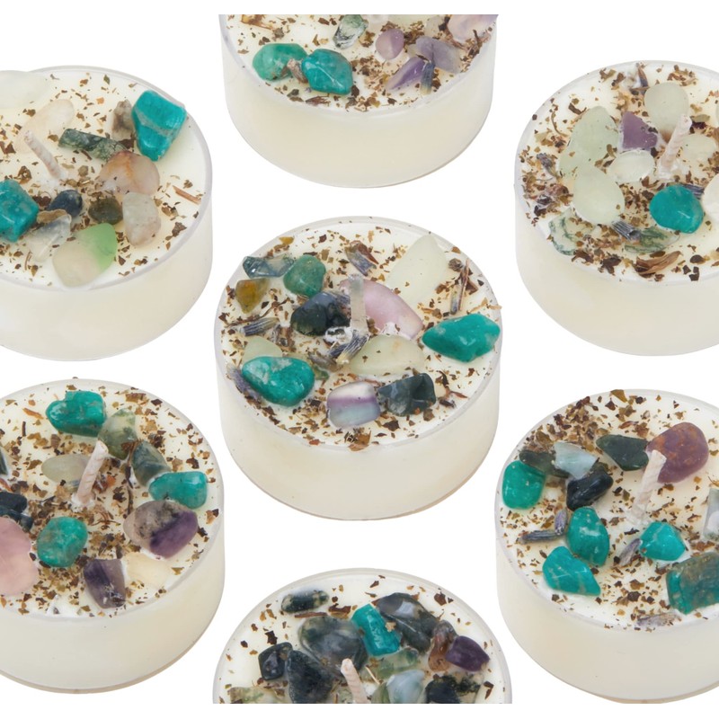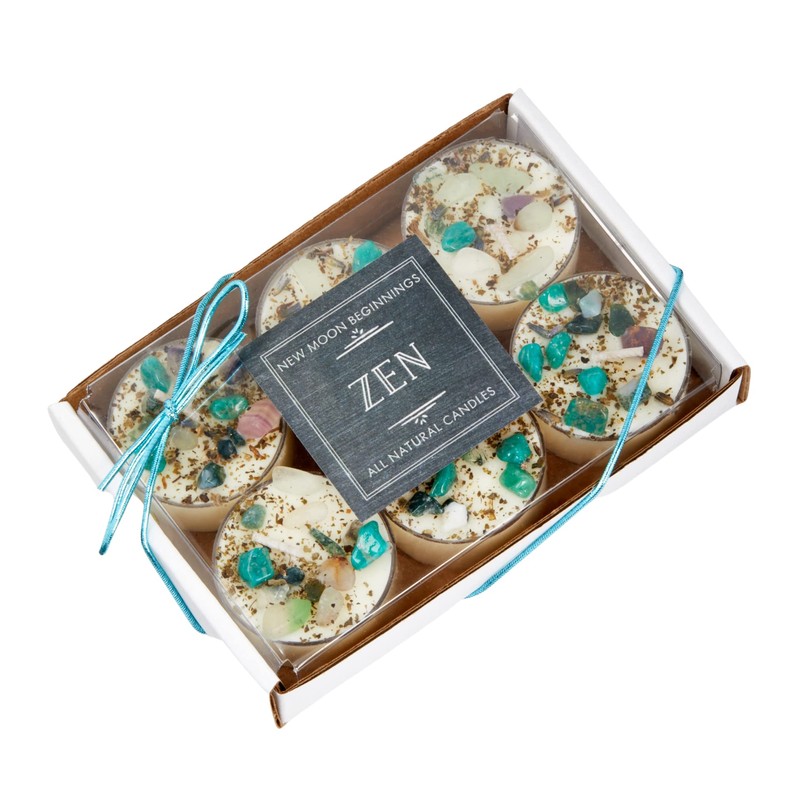 This listing is for a single (1) New Moon Beginnings Candle container or pack of tealights. New Moon Beginnings Candles are Handmade and Hand-poured in the USA. We use 100% Natural Soy Wax, Essential oils, Natural Fragrance Oils, and 100% Cotton Wicks (Lead-Free). Each candle is topped with Genuine Crystals and Stones, flowers, and herbs which are all mindfully selected to help set the intention of the candle.