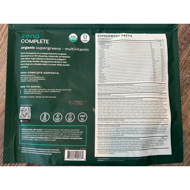 Zena Complete Organic Super Greens Powder & Multivitamin, 90+ Supergreens, Fruits, Veggies, 0 Sugar, 5G Fiber, Pre & Probiotics, Watermelon Citrus Flavor, 30 Packets