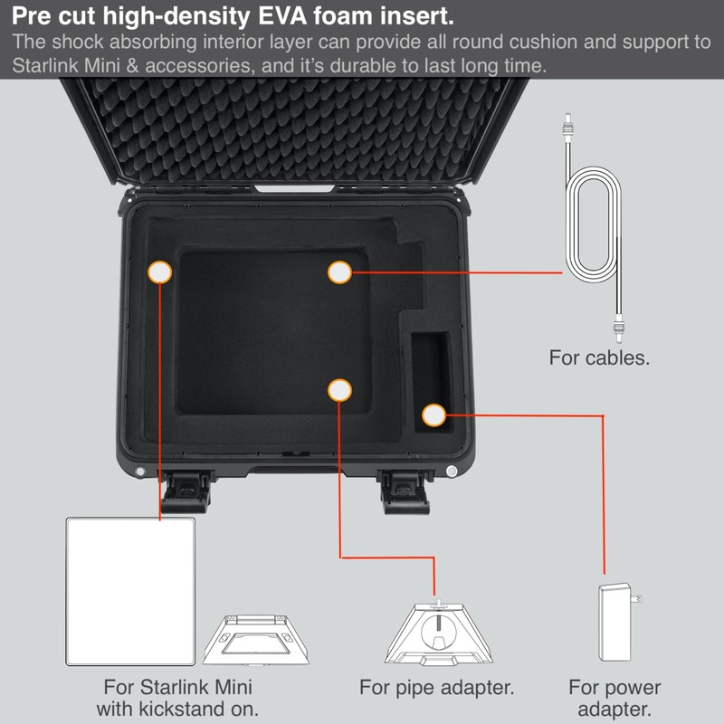 - CUSTOM INTERIOR INSERT: The interior of the case is padded with high-density EVA foam, thanks to its durability and ability to provide enough cushioning and support, the EVA faom insert can ensure the StarLink Mini and accessories always be safe inside the case, and prevent StarLink Mini from moving during transportation.