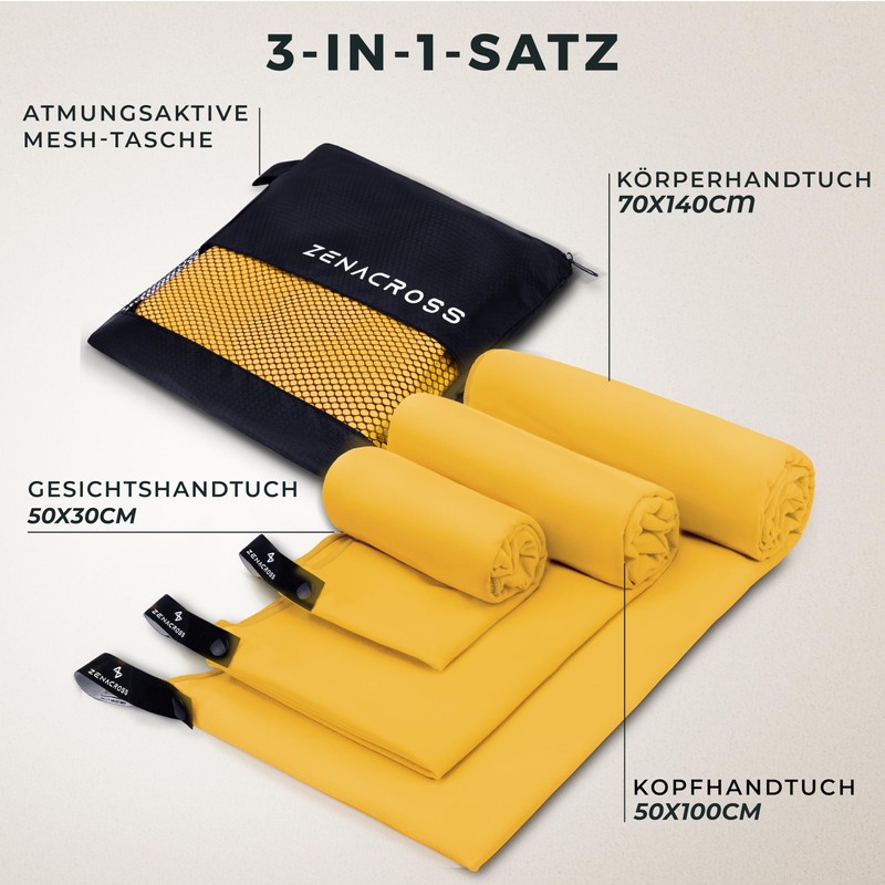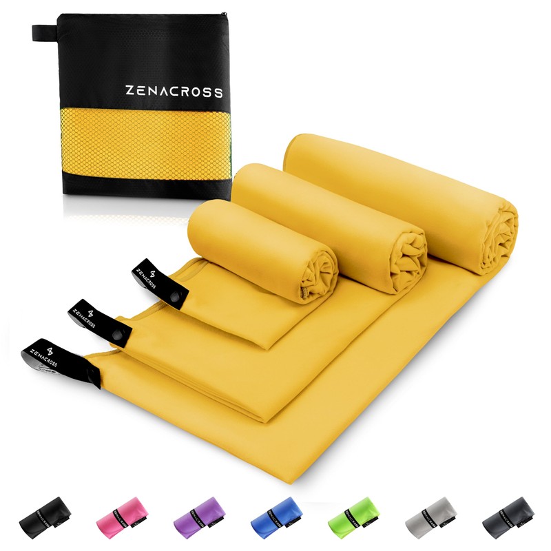 Zenacross Microfibre Towel (Set of 3) with Carry Bag - Quick-Drying and Versatile Fitness Towel - Sports Towel Sizes S, M, L - Yellow
