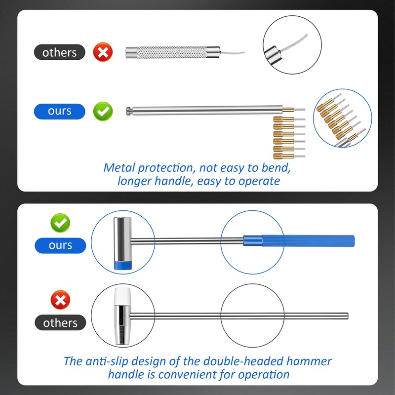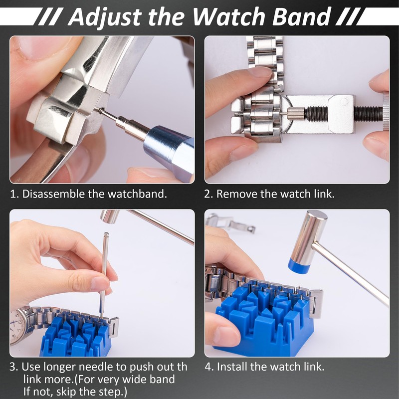 - Two Strap Remover with Use: The watch link remover is more suitable for directly removing the strap pin. The watch band holder and double-headed hammer are convenient for inserting the strap pin.