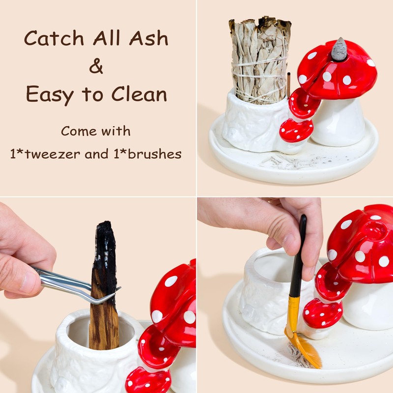 - [Packing List] 1 * Mushroom Incense Holder, 1 * Cleaning Brush, 1 * Tweezer (Not Include sage sticks, palo santo, candles,waterfall incense cone, and incense stick) Intellectual Property Notice:This product is patented and protected by law. Unauthorized reproduction or imitation is strictly prohibited and may result in legal action.