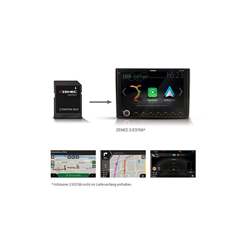 - Optional navigation software Z-EMAP66-MH3 for the ZENEC car radios / multimedia systems Z-E3766, Z-N965 and Z-N966: the micro SD card in the SD adapter is simply inserted into the SD card slot of the media centre, and the infotainers become fixed installation navigation systems with comprehensive navigation functions especially for Camcamcamcamand caravans.