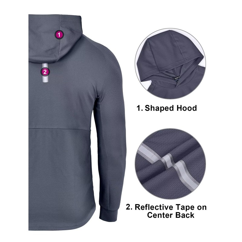 - Design: Specially-designed hood allows for clear vision and added convenience during activities.Underarm gusset allows for unrestricted movement during workouts.Centre-back reflective tape for safety during night runs(Can also be used as a locker loop).