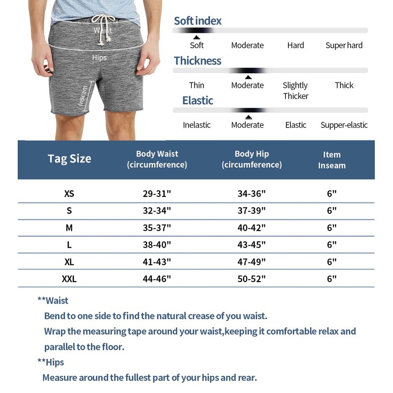 ***Why we choose this viscose blended terry to make men’s workout shorts? Fabric character of soft/breathable/stretchable, and special heathered colors, making the shorts not only fit for jogging\gym training, also acts well as lounge or pajama shorts. Light and without binding when wearing.