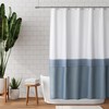 - A DECORATIVE FABRIC SHOWER CURTAIN TO REFRESH YOUR SHOWER SPACE: Features a stylish color-block design with crisp lines in blue and grey