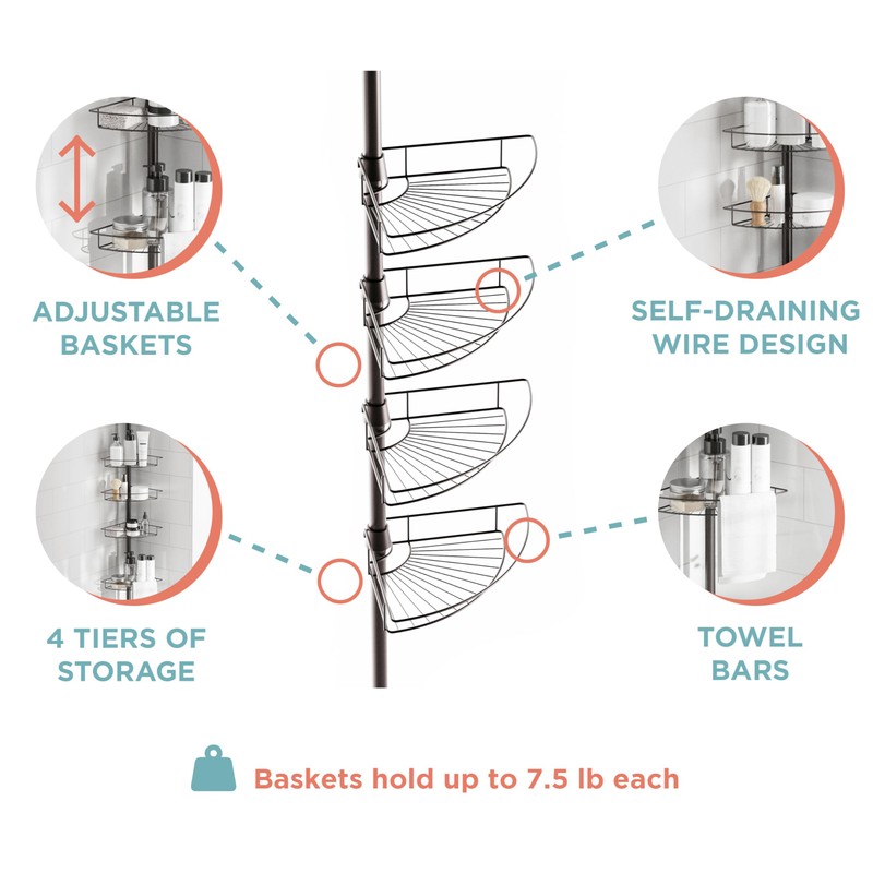 - 4 Adjustable Basket Shelves for Storage: This shower caddy tension pole features four wire baskets, adjustable to fit tall shampoo bottles, conditioners, and other bath essentials. Each spacious basket securely holds up to 7.5 lbs of weight.