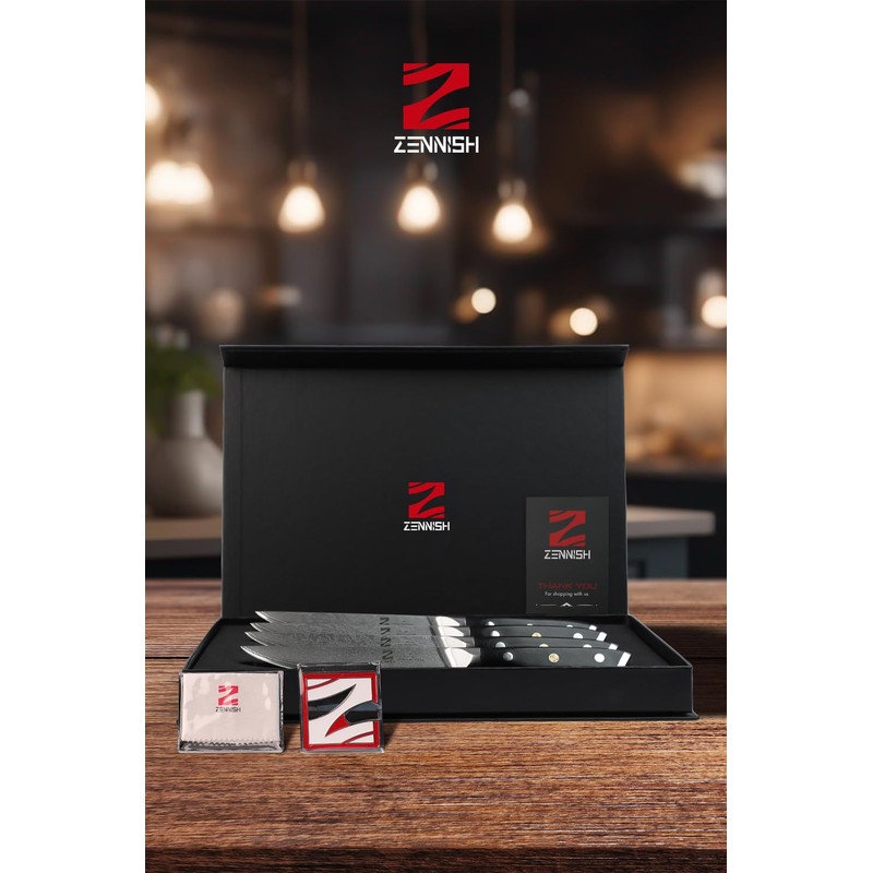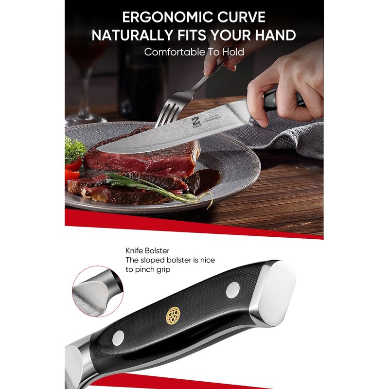 - Sturdy and Resistant: The Zennish steak knife is a resilient warrior, unafraid of the ravages of time. The Damascus knife's 67-layer steel structure greatly enhances corrosion resistance and rust resistance, it boasts a hardness rating of 60HRC. Through meticulous heat treatment, it maintains long-lasting sharpness and exceptional durability. The full-tang construction ensures perfect balance, making these non-serrated steak knives the trusted companion of families everywhere.