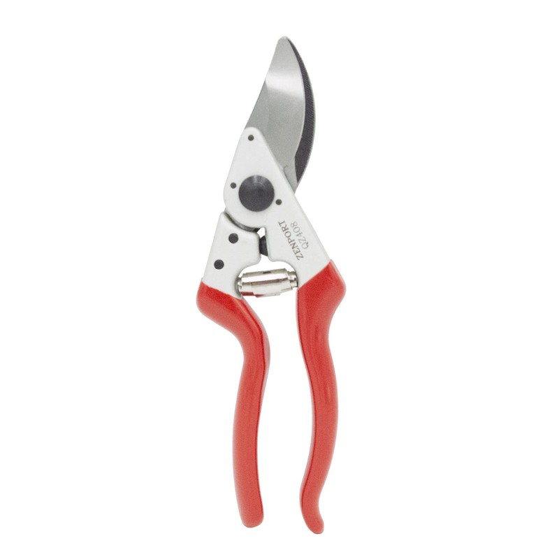 Zenport QZ408 Ergonomic Professional Pruner, 1-Inch Cut, 8.25-Inch Long. This pruner anvil blade is attached with screws instead of rivets, so the blade is easier to replace. Suitable for every type of pruning with its ergonomic hand fitting design. Superbly balanced, this bypass pruner offers a large cutting capacity. Narrow pointed anvil blade allows easy access to twiggy branches and assures a close cut to the trunk. Precision alignment of cutting and anvil blade is due to adjustable locking segment. Easy blade replacement. Shock absorbers reduce fatigue of wrist.