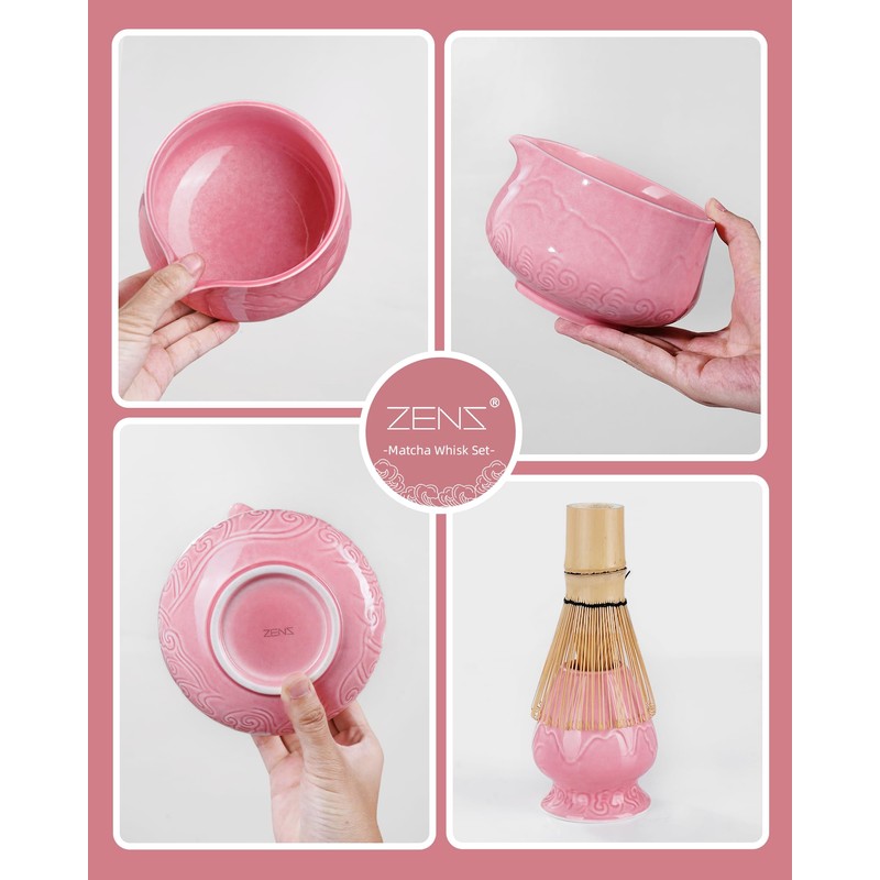 ZENS Matcha Whisk Set, 6pcs Matcha Set Pink Includes 15oz Ceramic Bowl and Bamboo Whisk (Chasen Holder) Scoop, 304 Sifter & Pink Tea Mat, Japanesse Matcha Kit for Matcha Latte-Making