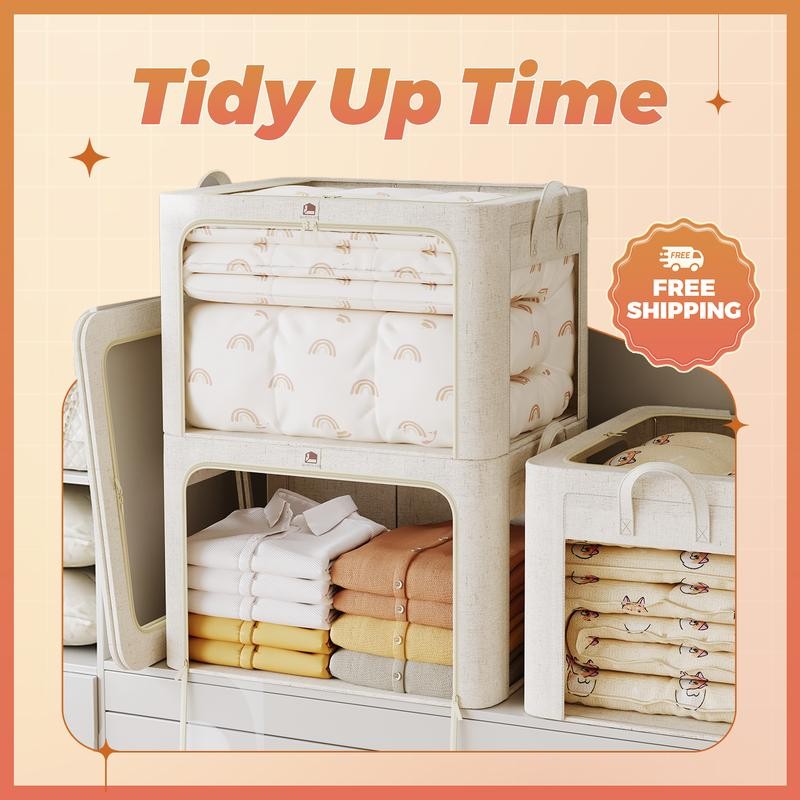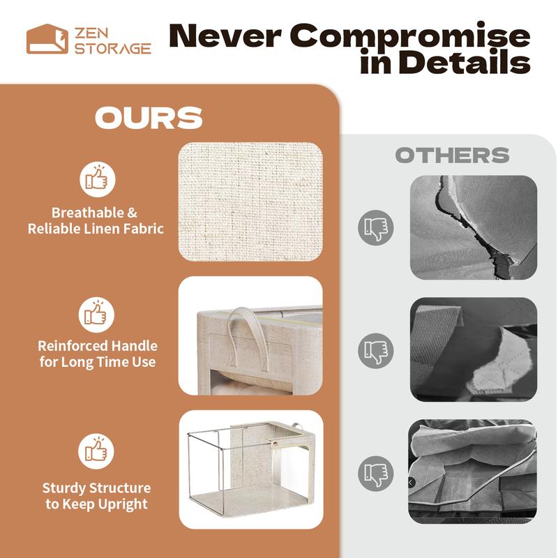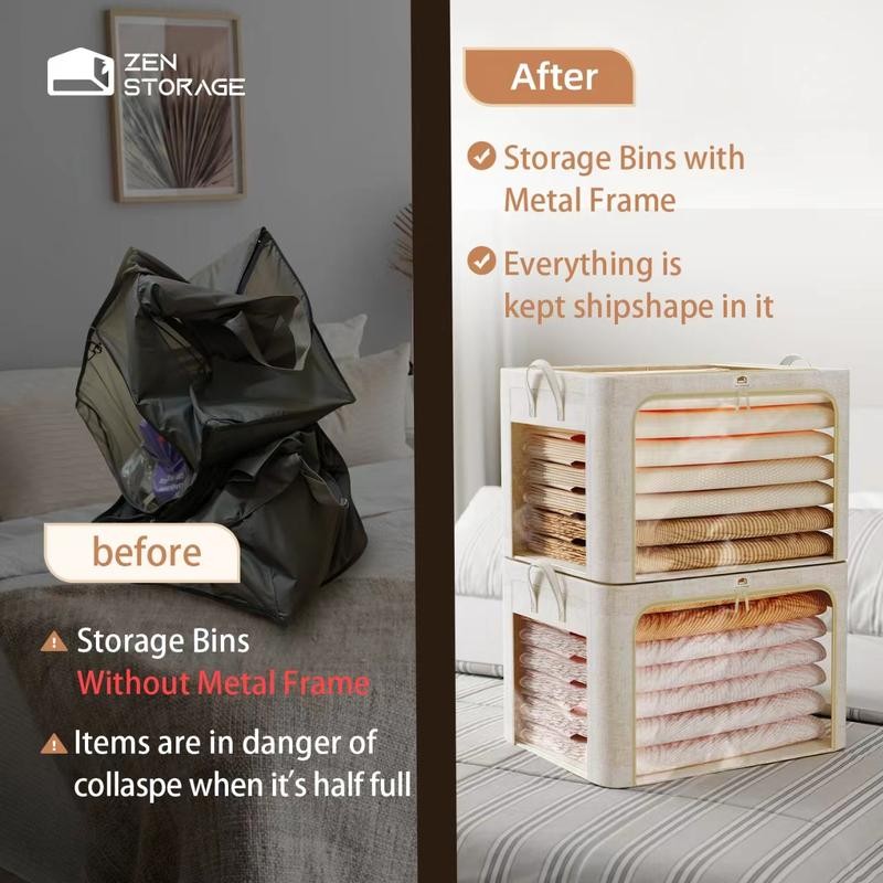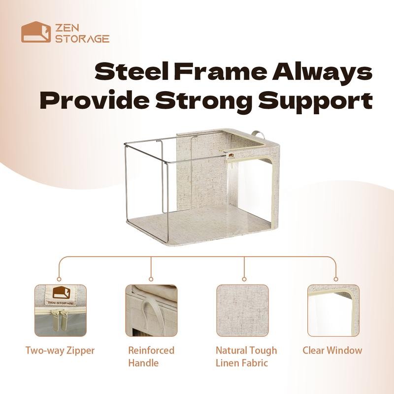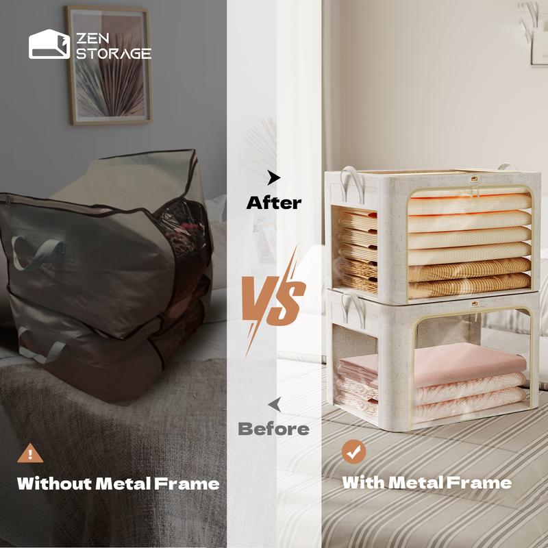 ZenStorage 3-pack stackable bins with metal frame,foldable linen,reinforced handles,blankets,comforters,pillows,and toys. Boxes Organiser Transparent