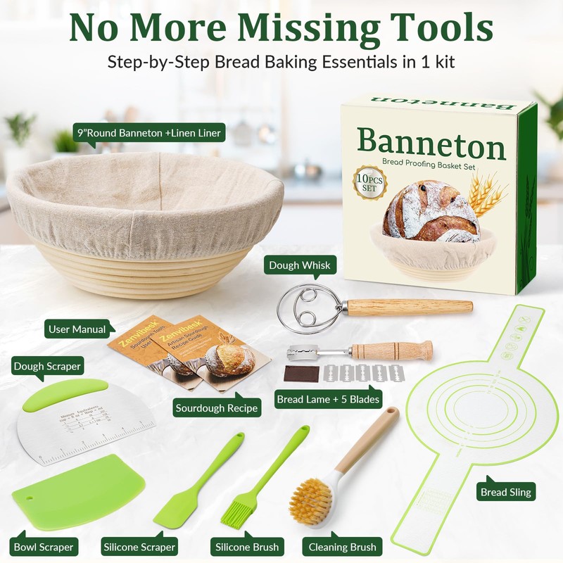- 9-in-1 Sourdough Kit – Ultimate Baking Set with Banneton Basket, Lame, Scrapers & More Includes: 9" Round Banneton Basket (Linen Liner), Silicone Bread Sling, Bread Lame +5 Blades, Dough Whisk, Dough Scraper, Bowl Scraper, Silicone Brush, Cleaning Brush, Silicone Spatula. Bake artisan sourdough bread & pastries effortlessly – all tools in one box.