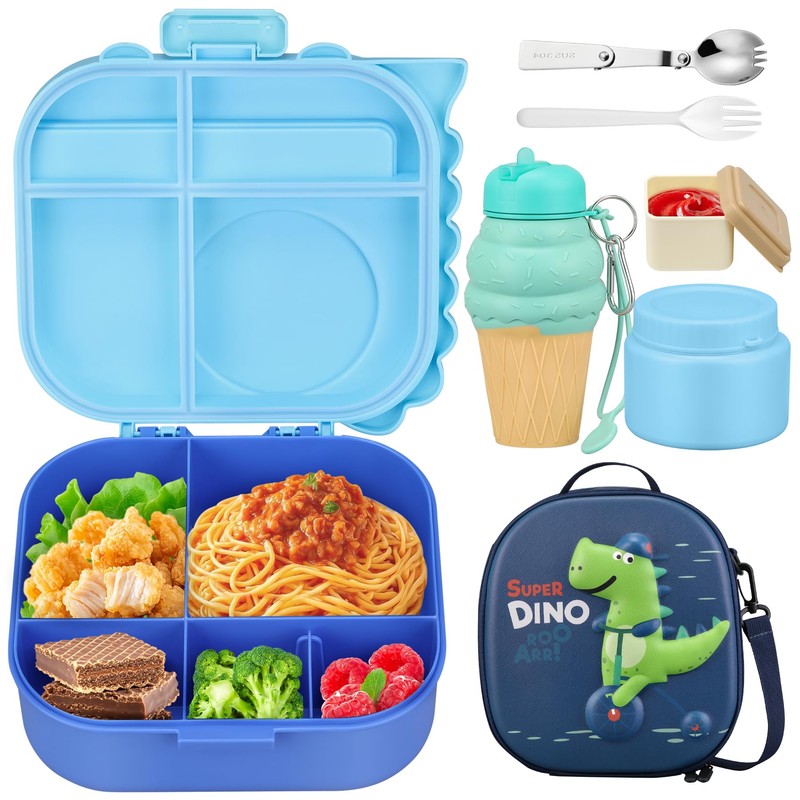 - 7pcs Kids Bento Lunch Box Set - kids lunch box set comes with a 40oz leak proof Bento Lunch Box, a 12oz hot food jar, a set of tableware, insulated lunch bag, Sauce Cups,1* DIY partition boardCan meet the needs of all boys, girls, kids, and toddlers. Let kids have fun and nutritious lunches at school or on their travels.