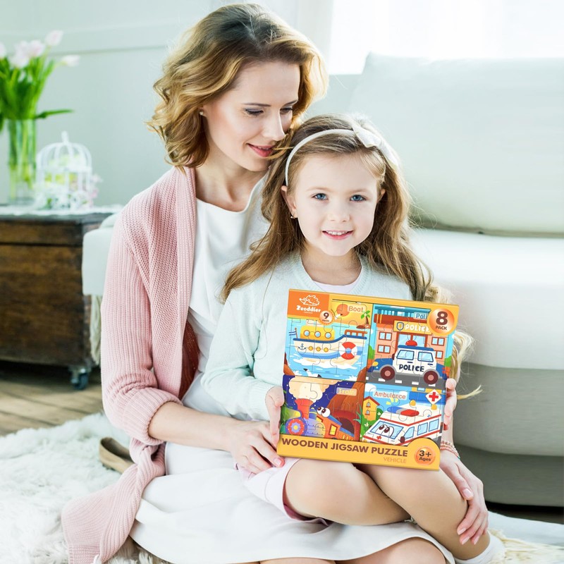 - đąă8 Pack Educational ToysăOur cute wooden puzzle set includes 8 different vehicles. It will provide hours of entertainment for your littel one. These puzzles are also durable enough to play everywhere you want - an excellent hand-eye coordination and preschool learning challenge for your child!