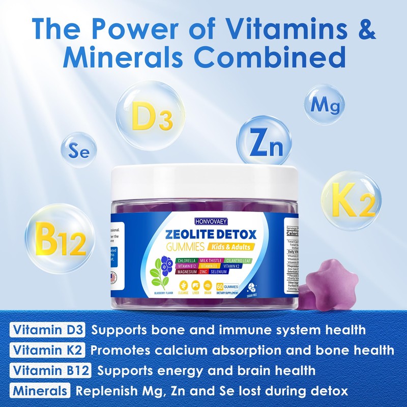HONVOVAEY Zeolite Detox for Kids & Adults, Clinoptilolite Zeolite Supplement with Vitamin D3 K2 B12, Supports Gut & Immune with Chlorella, Milk Thistle & Cilantro, 60 Blueberry Flavor Gummies