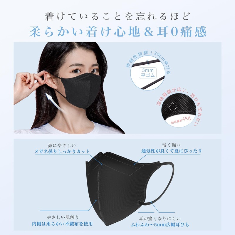 - 【耳0痛感&柔らかい着け心地】伸縮性が高く、5mmの幅広耳ひもを採用。長時間の着用しても耳が痛くなりにくい。マスクの内側はお肌にやさしくて柔らかい不織布生地を使用するため、肌への刺激が少ないです。なお、ワイヤー入りの構造でお鼻にしっかりフィット、メガネも曇りににくい。