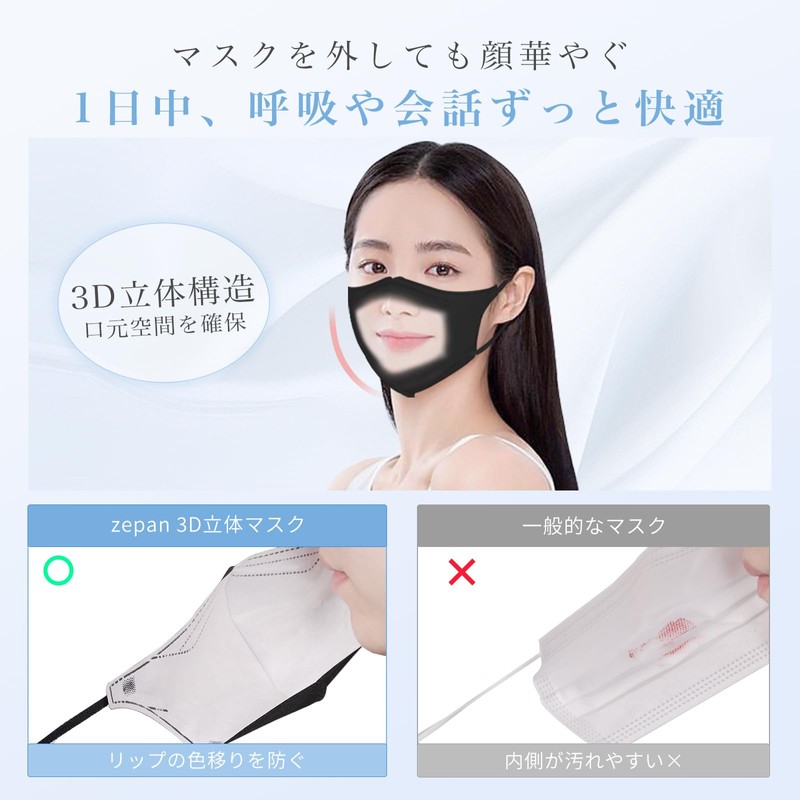 [zepan] マスク 黒 不織布 立体マスク 50枚 立体 3dマスク 個包装 小顔効果 三層構造 花粉症対策 通気快適 使い捨てマスク 耳が痛くない 肌に優しい
