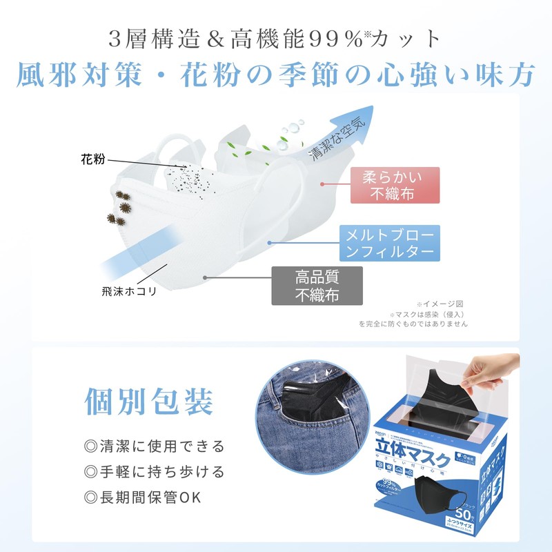 高品質な3層構造の不織布生地を使用、飛沫・花粉・PM2.5・ホコリ等を99%強力ブロック!衛生的な個別包装、カバンに常備しやすく、長期間の保管も可能となります。上下左右から顔をすっぽり包んでくれて隙間ができにくいためより一層の安心感。