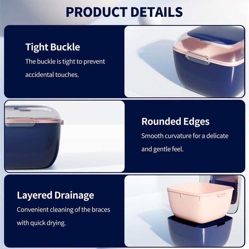 - Elegantes und Praktisches Design:Die Prothesenbox besticht durch ihr elegantes Design, das sowohl funktional als auch stilvoll ist. Die Handhabung ist besonders einfach, und der sichere Verschluss wird durch das praktische Scharniersystem und die zuverlässigen Druckclips gewährleistet, die die Box fest verschließen.