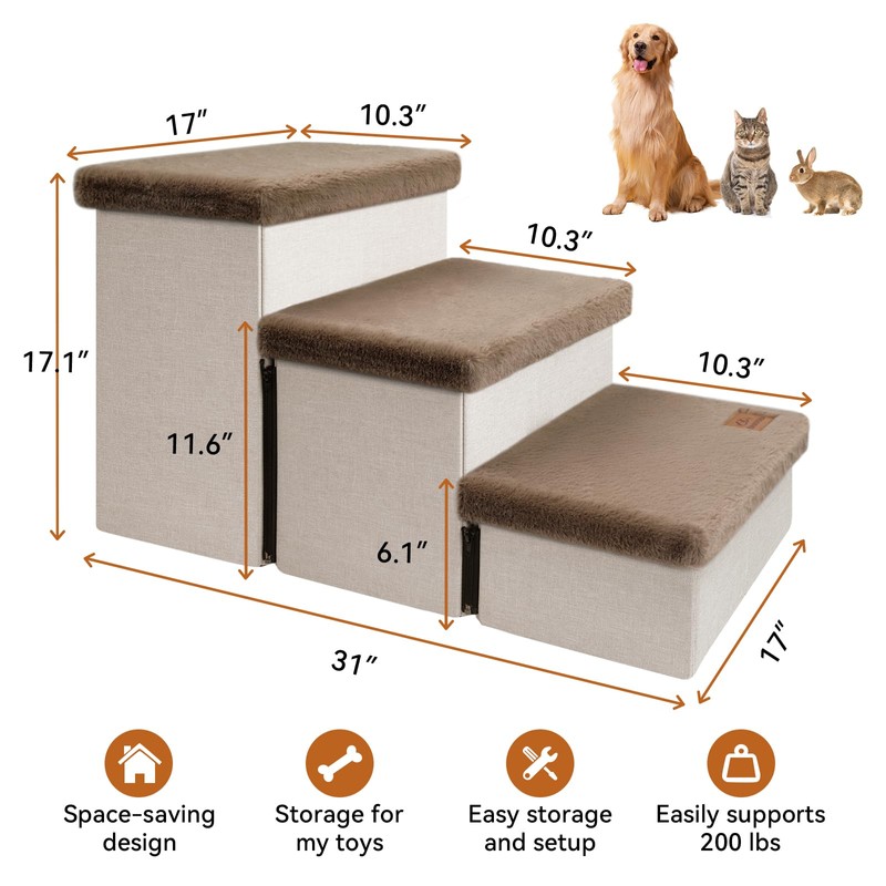 Zerbuger Dog Stairs with Furry Lids 18" H, 3-Step Wider Dog Steps with Storage for Small/Medium/Large Old Dogs Cats, Folding Sturdy Pet Stairs Climbing Bed Couch, Ramp for Car Up to 200 lbs, Khaki