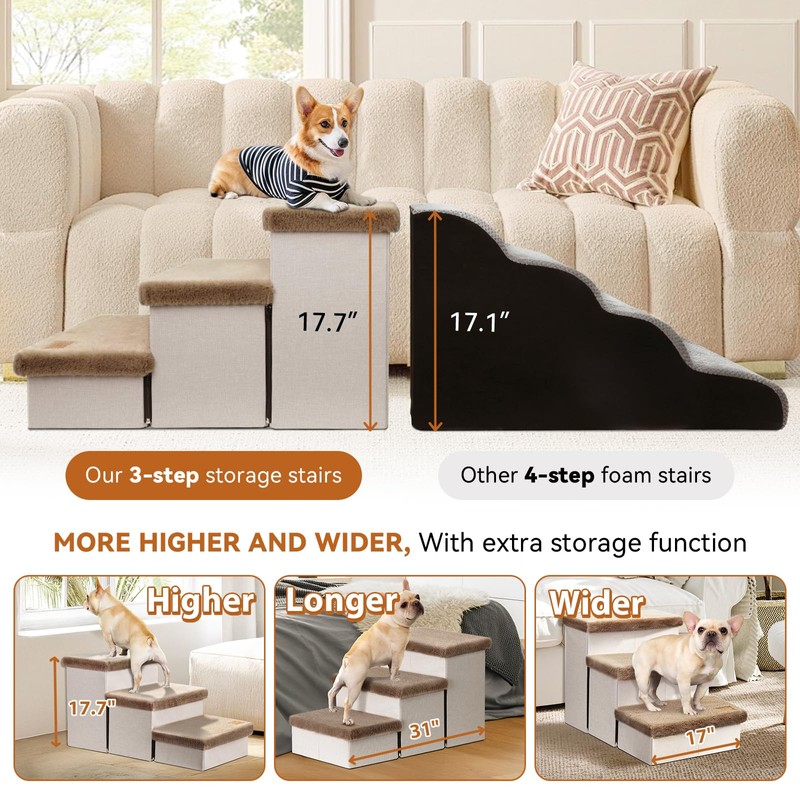 Zerbuger Dog Stairs with Furry Lids 18" H, 3-Step Wider Dog Steps with Storag...