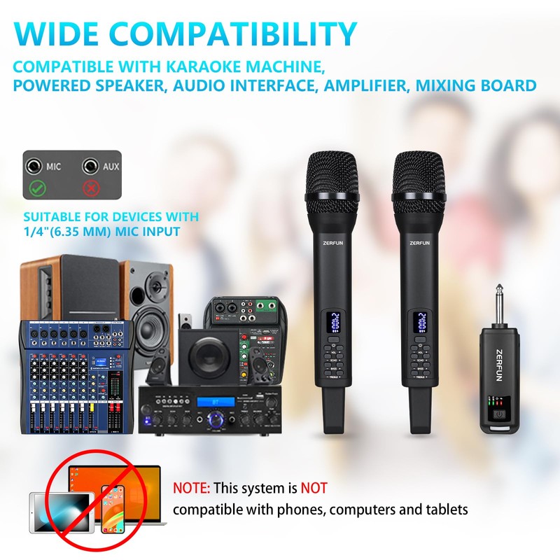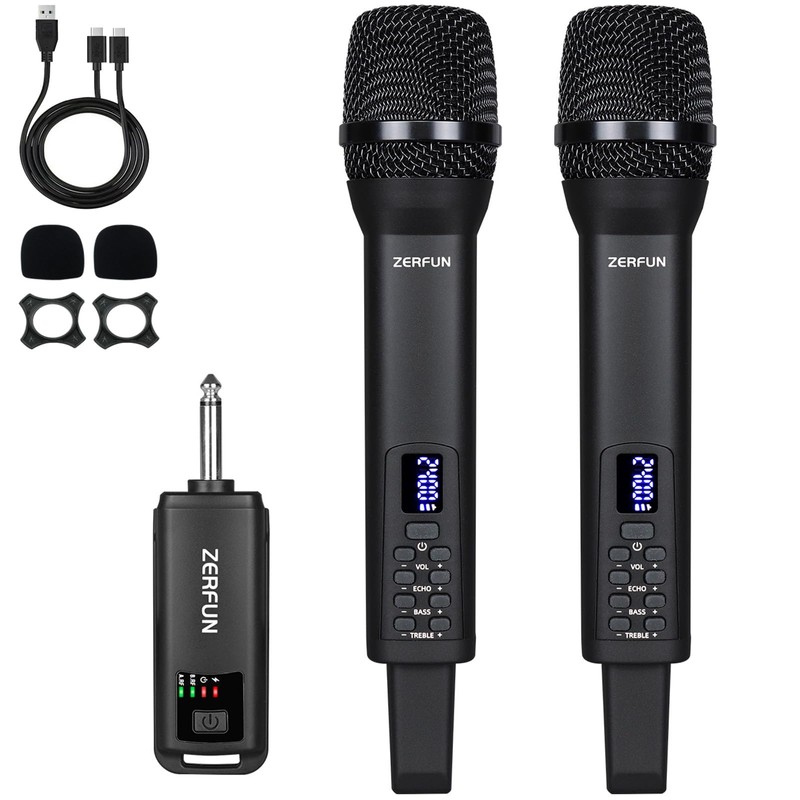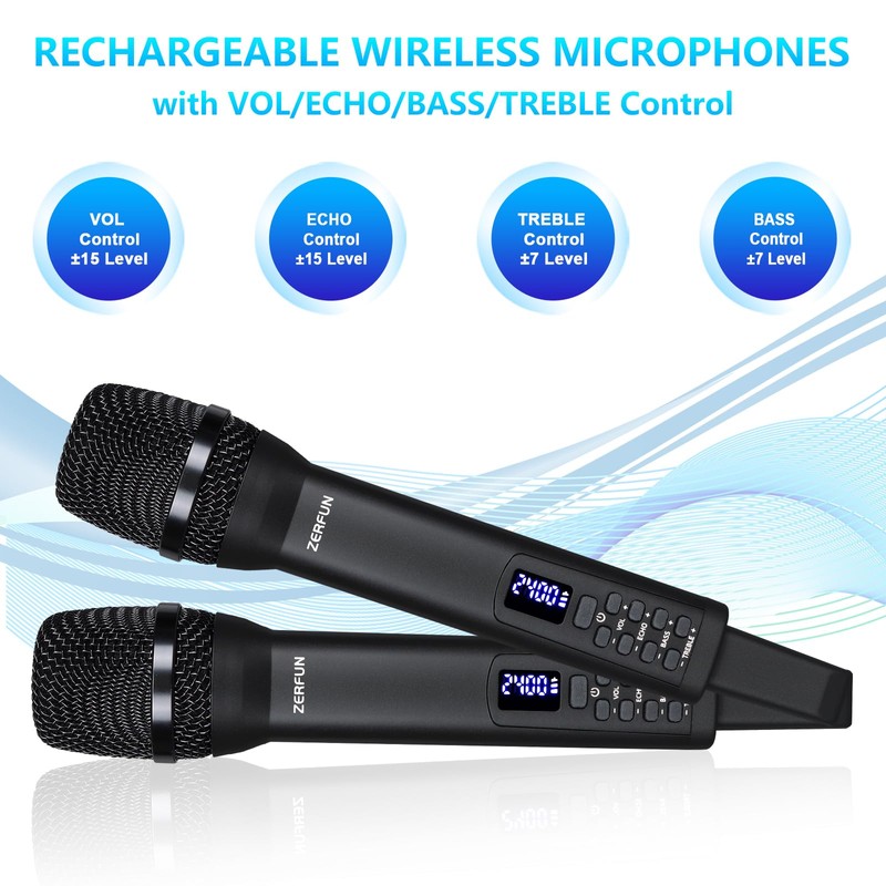 - Here are ZERFUN rechargeable wireless microphones! They are equipped with independent controls for volume, echo, treble, and bass. They are the perfect choice for home karaoke, meetings, parties, churches, DJ events, weddings, and so many more applications! These well-made cardioid wireless mics have the ability to pick up noise unidirectionally(Only when we speak towards the top of the microphone will there be a sound, while there will be no sound when speaking on the side). With this pickup pattern, the directional vocals can be effortlessly separated from the background noise.