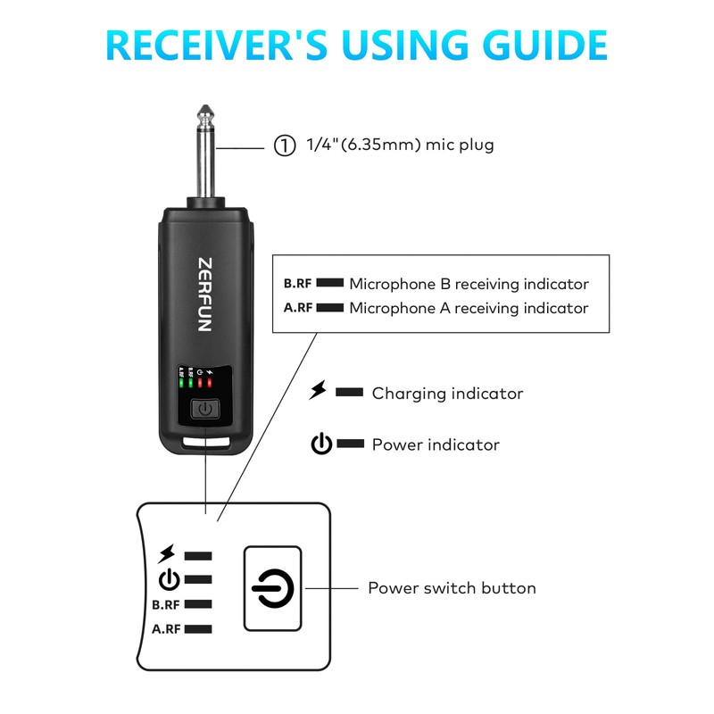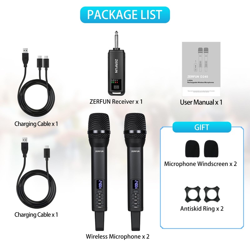 - Package List Includes: ZERFUN rechargeable wireless microphones x2; receiver x1; charging cable x2; microphone windscreen x2; antiskid ring x2; user manual x1. Genuine ZERFUN Wireless Microphone products come with supportive 24-Hours After-Sales Customer Service, 12-Month Manufacturer Assurance.